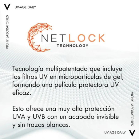 Vichy Capital Soleil UV-Age Daily Water incorpora la avanzada tecnología ‘Netlock’, que garantiza la estabilidad de los filtros y la fase oleosa, permitiendo una aplicación uniforme y efectiva. Además, es resistente al agua y al sudor, ideal para un uso diario sin preocupaciones.