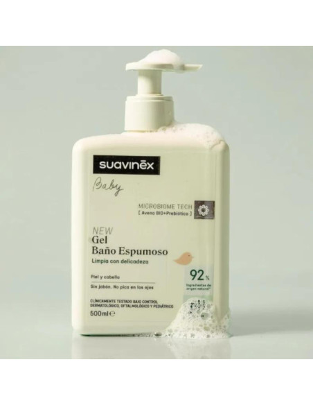Descubre el Gel-Champú Espumoso Pediátrico Microbiome Tech de Suavinex, ideal para la limpieza diaria de tu bebé. Con un 92% de ingredientes naturales y una fórmula suave sin jabón, ofrece una experiencia placentera y segura, manteniendo la piel y el cabello limpios y radiantes. ¡Haz del baño un momento divertido y cuidado para tu pequeño!