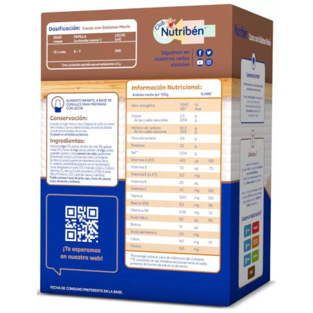 Nutribén Cacao con Galletas María 500g es una deliciosa papilla instantánea diseñada para facilitar la digestión de los más pequeños, enriquecida con calcio y vitaminas, ideal para fomentar hábitos alimenticios equilibrados desde temprana edad. Esta papilla está elaborada con ingredientes naturales, sin aditivos ni sustancias químicas, combinando cereales de cacao y galletas María para ofrecer un sabor auténtico y atractivo. Su formulación, con un alto contenido en cereales, garantiza que tu pequeño disfrute de una alimentación nutritiva y balanceada. Además, se disuelve fácilmente, evitando la necesidad de añadir más cantidad de producto y asegurando que no se sobrealimente al bebé. Nutribén Cacao con Galletas María se elabora mediante un exclusivo tratamiento de calor, evitando la hidrólisis excesiva, y está libre de transgénicos. Presentada en un práctico envase de 500g, esta papilla es perfecta para el ahorro familiar.